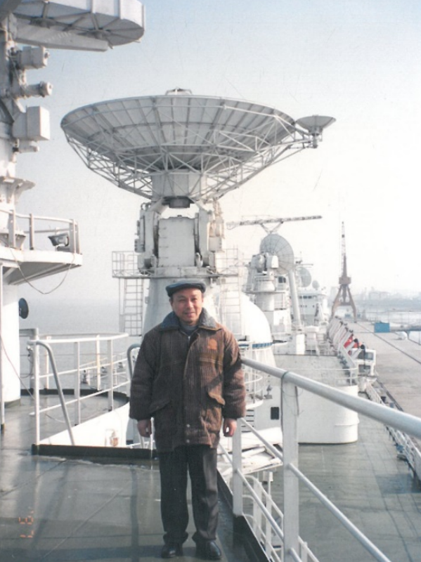 (1988年 杨叶谨在“远望二号”航天测量船留影)